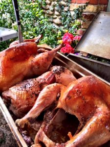 As this was to be a Christmas themed party of course Andy ordered slow roasted turkeys for the main event. The turkey, which we roast for several hours on site, was to be served with our chef’s secret family recipe cranberry sauce and lots of seasonal vegetables that we roast alongside the meat. As Andy really wanted to go all out as it had been a while since he had seen everyone, he also ordered a slow roasted side of lamb with rosemary and garlic potatoes that we always make sure are roasted to perfection and have just the right degree of fluffiness! We were also asked to provide a desert for Andy and his guests which was to be a Christmas pudding and a traditional chocolate gateau for good measure. Andy told us he would also be providing a cheese board, so his guests were sure to be spoilt for choice when the day came around!
